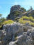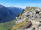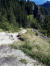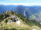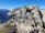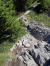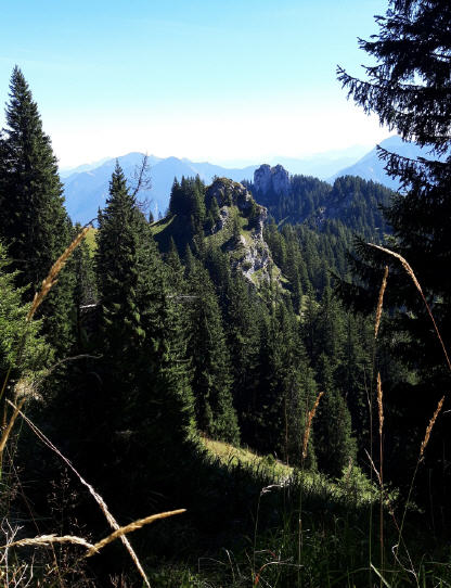 Erstmal aber geht es meist im Mischwald nach oben, bald steil. Auffallend die hohen Fichten, unten oftmals karg, oben dunkelgrün. Kurz vor dem Kamm ein paar enge Kehren in steilem Gelände und eine Kletterpassage, nicht ausgesetzt, aber hohe Stufen. Oben dann die typischen Felsformationen der Ammergauer Alpen, eigentlich Manndln, überall. Auch Weibln habe ich gesehen. Und Kindln. Diese vor allem hier nahe dem Schartenkopf.