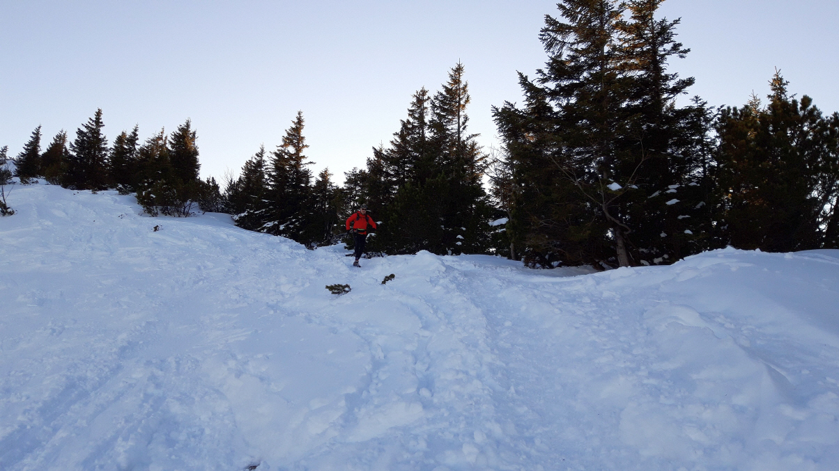 Weiter zum Hirschberghaus. Zwei große Tafeln. Nach rechts: Über Kratzer nur für Geübte. Nach links: Sommerweg – gesperrt wegen Lawinengefahr. Die aber soll heute gering sein. Die Warnstufe war auf 2. Einschätzen kann ich das Ganze nicht, der Abstiegsweg ist aber gut gespurt. Hell ist es auch noch.