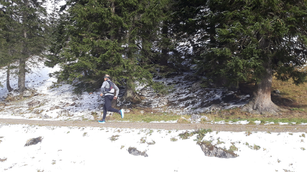 Vorbei am See und an den Ruchenköpfen, laufe ich in 5 bis 10cm tiefem Schnee. So war das nicht geplant. Zwar rechnete ich mit einer dünnen Schneeauflage, nicht aber in diesem Maße. Schön hätte es heute in der Sonne sein können, und ich Depp laufe und latsche nordseitig herum. Mit meinem neuen Trailrunning-Schuh, dem Salomon Ultraglide 2, den ich heute testen wollte.