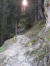 --------------------------------------------- Ärgerliches: Anfang des Jahres kaufte ich mir den HOKA ONE ONE Speetgoat 5. Ende Mai lief ich ihn das erste Mal. Nach nichteinmal 200km lösten sich an beiden Schuhsohlen die einzeln verklebten Profilteile im Fersenbereich. Das war beim Vorgänger, dem 4er, auch so, immerhin haben die 400km gehalten. Wenn ich jetzt reklamiere, bekomme ich qualitativ nochmal so einen Sch… dreck. Ich suche nach einer anderen Lösung und werde fündig: Schuster Seidl in München Schwabing repariert auch Laufschuhe. Für 30.- Euro inkl. Trinkgeld habe ich jetzt wieder einen funktionsfähigen Trailschuh – siehe Foto -, der sich heute bewährt hat. ---------------------------------------------- Der angekündigte starke Wind blieb aus, ich verweile und mache Mittag. Nassgeschwitzt fühle ich mich dennoch unwohl und mache mich wieder auf. Vorbei an den seilversicherten Felswänden erreiche ich bald den Abzweiger: Weißenbachsattel/Weißenbachalm. Toller Blick hinunter. Ebenso der Pfad.