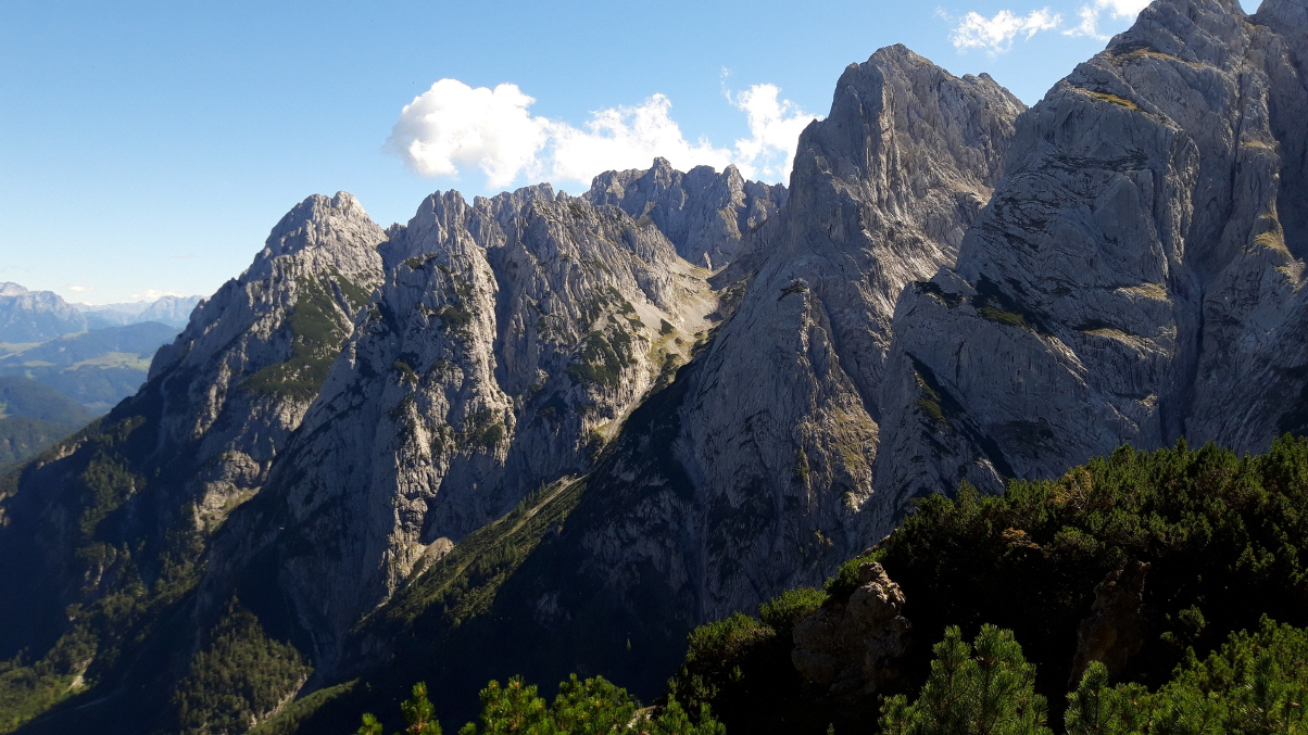 Das einzige, was mir nach der Baumgrenze zu schaffen macht, ist die Sonne bei ohnehin schon hohen Temperaturen. Dafür entschädigen die bizarren Felswände und die Gipfel des Predigtstuhl und des Mitterkaiser über mir, der das Griesener Kar in einen westlichen und östlichen Teil trennt.
