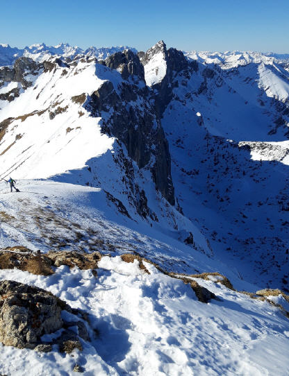 ... der Blick in das tiefe Blau, auf das Weiß, auf die Felsformationen … hinüber zu den Nordwänden der Hochiss, die ich im Oktober 22 besucht hatte, fantastisch. Noch ein paar Meter klettern und ich stehe wiedermal auf der Rofanspitze.