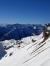 Anstrengend ist der Eiertanz mit Einsinken, mein Puls geht kaum unter die 150 Schläge. In Serpentinen geht es den nochmals steiler werdenden Hang hinauf. Die Aussicht allerdings …