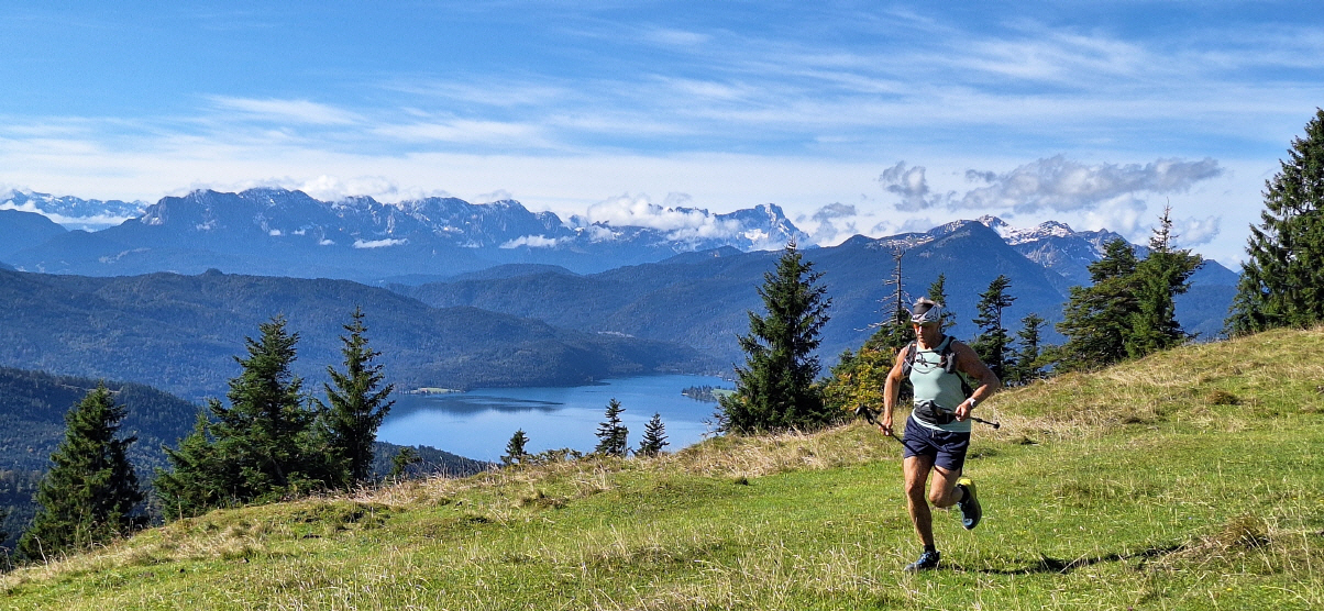 Ich laufe los, hinein den Schatten, erreiche den Abzweiger und habe bald einen sehr steilen und holprigen Pfad unter meinen Füßen, der sich in Serpentinen den Bergwald hinauf schlängelt. Dann wird es licht und ich erreiche die Pfundalm. Pfundig der Fernblick ins Karwendel und runter auf den Walchensee.