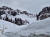 Mit den beiden Mädls mache ich mich auf, den harschigen Hang hinunterzulaufen. Die eine rodelt mit ihrem Rucksack und Hund im Rücken hinunter. Die andere und ich nehmen die Dirett … - ihr wisst schon – unter die Füße; immer schön rein mit der Ferse und aufrecht geht es 300hm flott hinunter.
