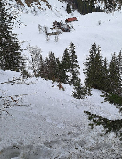 Ein Vater mit seiner Tochter kommen herauf, mit Schneeschuhen. Auch zwei Männer, einer mit Merino Kurzarmshirt ."Ist doch warm, hatn Föhn", sein Spezl mit Straßenlaufschuhen. „Ich bin das so gewohnt“. Dann noch zwei Mädls, die den steilen, verschneiten Südhang rauf sind. Ich frage nach dem Weg und bekomme zur Antwort: „Du legst dich am besten auf den Rücken und rutscht hinunter. Jedenfalls musst du zu den beiden Hütten da unten und von dort links in den Wald.