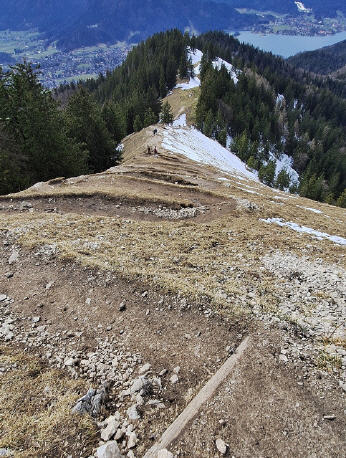 Einen kleinen Tipp für die Runde bei Schnee habe ich aber noch: Auf den Fotos nicht so recht zu erkennen ist die Steilheit des Nordhangs der Baumgartenschneid. Bei Harsch kommt man ohne Grödeln kaum hoch, und bei nassem Schnee rutscht man weg. Auch heute sind wieder ein paar Wanderer da oben rumgeeiert und kaum vorwärts gekommen.