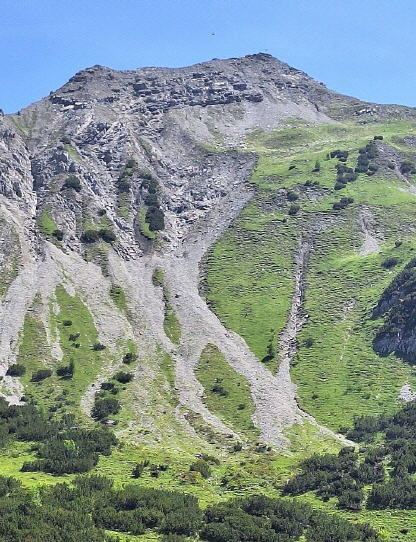 Vor mir ein seltsamer Berg, dem ich erst heute, nach meiner Tour im Oktober 2024 auf die Rappenspitze, Beachtung schenke: Der Rauhe Knöll. Einmal, weil ich meine Aufstiegsroute an seiner Nordflanke rauf zum Lunstsattel studieren kann, zum anderen, weil ich mich frage, ob überhaupt jemand auf diesen gar nicht hübschen Berg klettert. Der bröselt ja schon, wenn man nur hinguckt. Schotterreißen wohin man blickt.