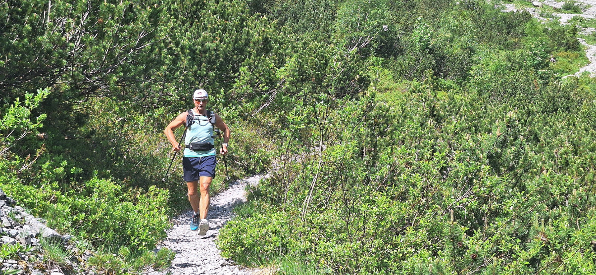 Ich parke bei der Gramai-Alm und spüre jetzt schon die stehende Luft in diesem Talkessel des Gramaier Grundes. Mit 1,5 Liter Wasser in der Trinkblase und 0,5 Liter Electrolytgetränk mache ich mich auf den Weg und hoffe, wenigstens noch ein Stückchen im Schatten der Berge in Richtung Aufstieg zur Lamsenjochhütte voranzukommen. Ein frommer Wunsch! ------------------------------------------------------ Hier die Etappen meiner 14km langen Runde, unterfüttert mit 1100hm: Gramai-Alm (1256m) – Lamsenjochhütte (1953m) - Westliches Lamsenjoch (1940m) – Binssattel (1906m) – Hahnkampl (2080m) – Binssattel (1906m) – Gramai Hochleger (1756m) – Gramai-Alm (1256m). Hier die Runde auf BRouter.de --------------------------------------------------------- Wenigstens steigt der Pfad über den Schotter nur leicht an und ist gut laufbar. Im letzten Drittel wird er dann steil. In zahlreichen Serpentinen schraube ich mich nach oben. Obwohl ich viel trinke, ist es mir irgendwie damisch. Ein Trost, dass man als Wanderer in 2 Stunden oben sein soll.
