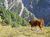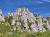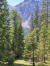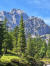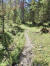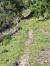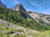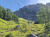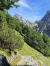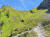 Flach geht es weiter inmitten sattem Grün, bald über ein ausgetrocknetes Flussbett und gleich gegenüber rein in den Zauberwald mit seinem lockeren Baumbestand, der immer wieder den Blick frei gibt auf die Bergspitzen vor mir. Nach zwei Felsblöcken wird es steiler und ich lande auf einer Schuttreiße.
