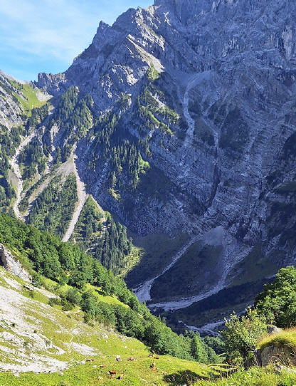 Wieder in paar hundert Höhenmeter tiefer erreiche ich den Tortalalm Niederleger, wo es Buttermilch und Milch zu kaufen gibt. Für meinen Magen eher nix, also weiter am Torbach entlang das Tortal runter. Vor einem Jahr bin ich hier im Schatten hoch, heute geht es in der Sonne runter.