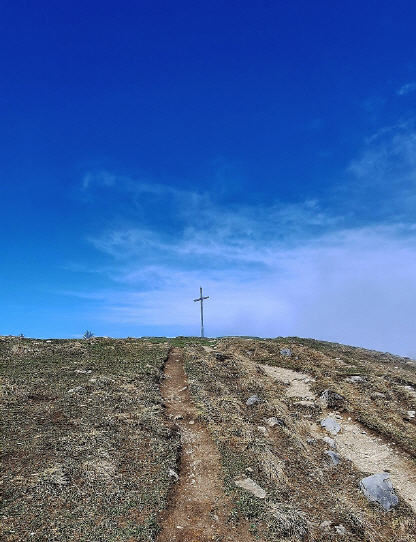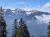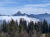 Gut 100hm weiter verlasse ich den Bergwald, laufe über eine Wiese weiter rauf zum Kreuz und staune: Ein Wolkenmeer nördlich unter mir. Schiebt und schiebt. Schnell ein paar Fotos gemacht, auch von den noch freien Bergen des Vorkarwendels mit dem Juifen im Mittelpunkt. Der Mordsbrocken mit seinen ausschließlich Forstwegen fast hinauf zum Gipfel.