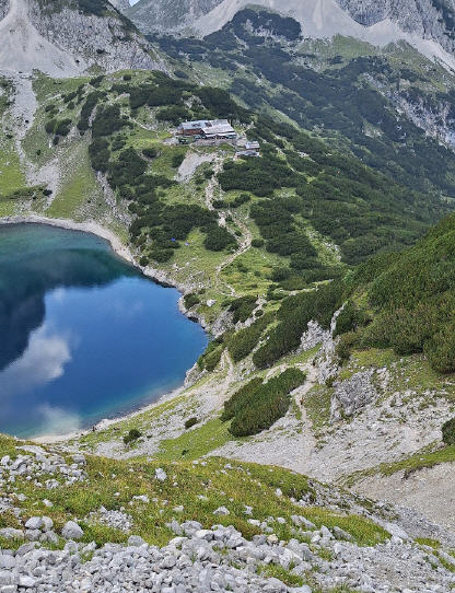 Nach der Abkühlung der kurze, knackige Aufstieg zur Coburger Hütte. Erstmal den Blick schweifen lassen auf den Drachensee und den Drachenkopf, und auch auf die vor uns liegende Aufstiegsroute zum HinterenTajatörl.