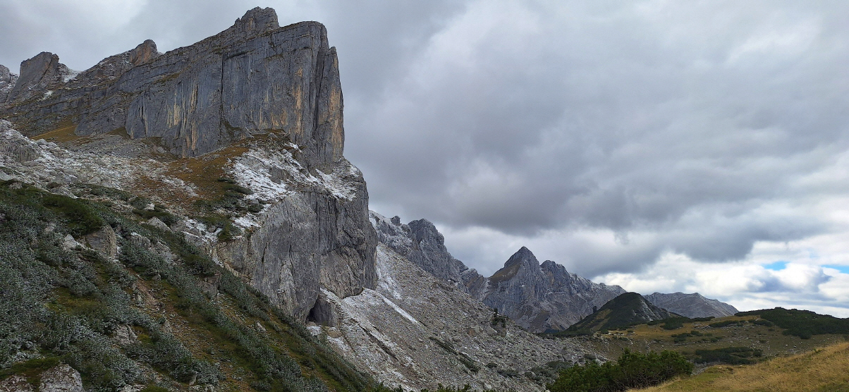Spätestens hier weiß man, wofür man sich geplagt hat. Das Herz verrät es einem. Es sollte noch imposanter werden: bei Überschreitung des Marchgatterls tauchen die senkrecht abfallenden Nordwände einiger prominenter Rofangipfel auf bis hinter zur Hochiss, die ich zweimal bestiegen habe, zuletzt am 31.10.22 zusammen mit dem Spieljoch