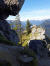 Erstmal aber geht es meist im Mischwald nach oben, bald steil. Auffallend die hohen Fichten, unten oftmals karg, oben dunkelgrün. Kurz vor dem Kamm ein paar enge Kehren in steilem Gelände und eine Kletterpassage, nicht ausgesetzt, aber hohe Stufen. Oben dann die typischen Felsformationen der Ammergauer Alpen, eigentlich Manndln, überall. Auch Weibln habe ich gesehen. Und Kindln. Diese vor allem hier nahe dem Schartenkopf.