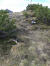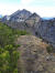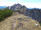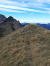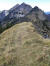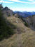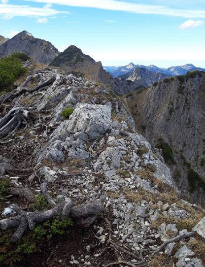 Zu den Wurzeln gesellen sich alsbald kleine felsige Abschnitte, aber auch die sind links gut zu umgehen. Das letzte Stückchen laufe ich wieder, weil das Grasband am Kamm entlang - mal schmal, mal breit - , trocken ist. Auch hier bleibe ich stehen und gucke in die Tiefe und zurück auf den Grat, der mich hierher gebracht hat.