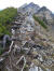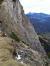 Noch immer alleine unterwegs, erreiche ich das kreuzlose Wildenkarjoch, dass meist nicht bestiegen wird. Ein Pfad ist nicht auszumachen, dafür eine sehr steile schrofige und bröselige Passage. Der Tiefblick aber unterhalb an der Kante ist fein.