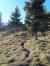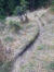 Auf gleicher Höhe laufe ich einen geraden Trail, 2km lang, in östliche Richtung. Holprig ist er, übersät mit Wurzeln und Steinen, ein Flow mag nicht aufkommen. Abrupt bleibe ich stehen … ist da nicht … ? Doch, eine Gämse ca. 50m vor mir auf dem Pfad. Guckt in meine Richtung. Langsam gehe ich näher ran, bis sie mich wittert und weiter nach oben läuft.