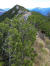 Mal am Kamm entlang– nicht ausgesetzt - , dann wieder unterhalb, führt der Pfad hinauf zum Gipfel. Dort steht ein sehr bescheidenes Kreuz. Von hier aus ist der Grat hinüber zum Wildkarjoch gut zu sehen, auch, dass die ein Kilometer lange Verbindung sehr abwechslungsreich ist.