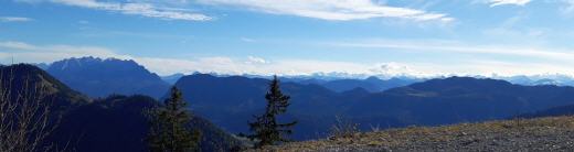 Zwei Mal noch kürze ich den Forstweg über steile Pfade ab, zuletzt jedoch bringt mich der Fahrweg zur Schönfeldalm (unbewirtschaftet). Fantastisch das Panorama, das langsam vorbei zieht. Links zwei weitere Bekannte, der Zahme Kaiser und der Wilde Kaiser, rechts die Kitzbühler Alpen und die Riesen der Hohen Tauern.