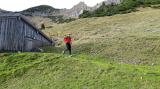 In einem weiten Bogen führt mich jetzt der Pfad über den Wildenkarsattel hinunter zu einer Holzhütte der Wildenkaralm. Schon von der Ferne sehe ich dort jemanden am Wegrand sitzen mit einem signalgelben Anorak. Prima, endlich jemand, der ein Foto von mir schießen kann.