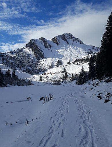 Am Miesingsattel beginnt der Downhill, erstmal durch tiefen Schnee runter zur Kleintiefental Alm. Ein älterer Herr kommt mir entgegen, fragt, ob ich vielleicht eine optische Brille gefunden hätte. Er weiß noch genau, wo er sie Montag verloren hat, zwischen diesem Sattel und dem (weit) dort drüben. O je! Ich wünsche ihm viel Glück und würde mein Pfeifchen am Trinkrucksack bemühen, wenn ich sie finden sollte.