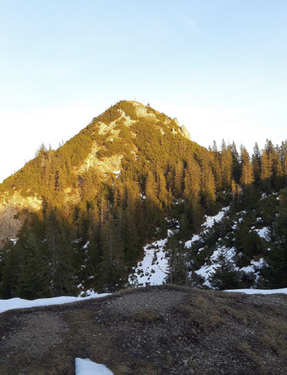 Von der Alm ein Stück runter und über eine leicht vereiste Holzbrücke, dann rauf zum Graseck. Von dort bis zum Gipfelaufbau sehr schrofig. Einhundert Meter über weichen Schnee. Der Schildenstein taucht auf und zeigt sich in warmen Farbtönen. Wenigstens ein bisschen Romantik, die ich bis jetzt leider vermisst habe.