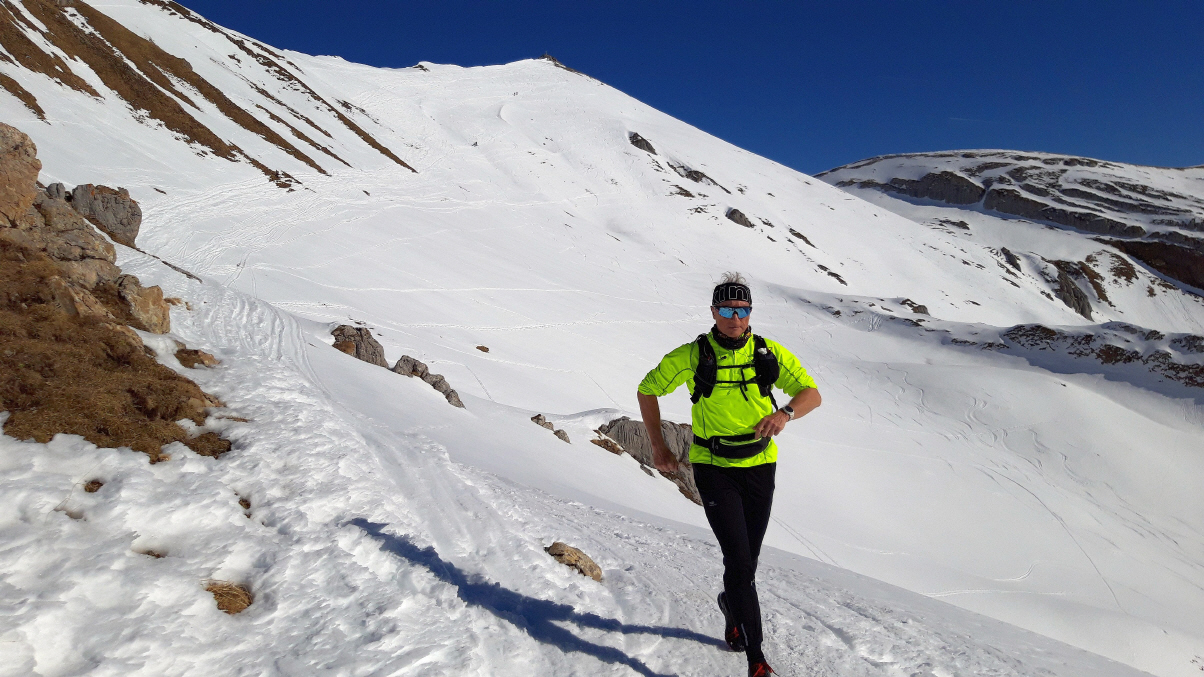 Mangels einer Plastiktüte (an was man nicht alles denken muss, beim Wintertrailrunning!), rutsche ich auf dem Allerwertesten ca. 50hm den Hang hinunter und hoffe, keine Lawine auszulösen, und weiß jetzt, woher der Begriff arschkalt kommt. Alles nass, bis auf die Haut, und dazu vom Regen in die Traufe gekommen, da es unten noch schwierigere Verhältnisse hat.