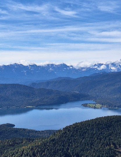 Noch eine ganze Weile stehe ich bei Windstille am Kreuz und genieße die Aussicht, auch hinüber zum Jochberg und dem Herzogstand dahinter, wo ich vor 3 Wochen unterwegs war.