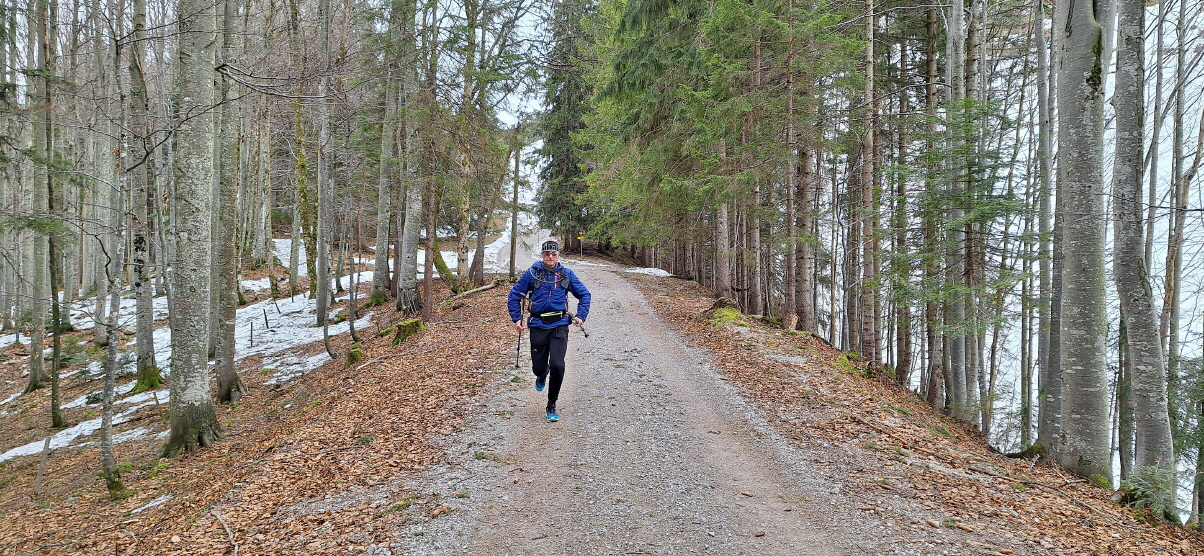 Ich muss mir im Winter abgewöhnen, eine Vorstellung von der Strecke zu haben. Am Seeberg wurde ich vor gut einer Woche mit einem trockenen Pfad auf der Nordseite überrascht. Heute mit einem nahezu spurenlosen sehr steilen Nordhang rauf zur Bodenschneid.