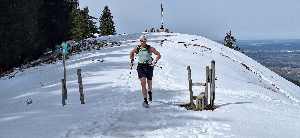 Einen kleinen Tipp für die Runde bei Schnee habe ich aber noch: Auf den Fotos nicht so recht zu erkennen ist die Steilheit des Nordhangs der Baumgartenschneid. Bei Harsch kommt man ohne Grödeln kaum hoch, und bei nassem Schnee rutscht man weg. Auch heute sind wieder ein paar Wanderer da oben rumgeeiert und kaum vorwärts gekommen.