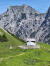 Ich erreiche die Kante mit gelben Wandertafeln, laufe links hinüber und erreiche die rustikale Lamsenjochhütte. Ein feines kühles Windchen weht. Auf der Toilette kippe ich mir eiskaltes Wasser über den Kopf und eine Ladung über den Rücken.
