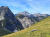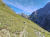 Noch zwei Wanderpärchen und ein Herr genießen die Aussicht, sonst nicht viel los heute. Der Blick hinunter auf den vor mir liegenden Pfad verheißungsvoll, die Bergflanken fantastisch. Fein windet sich der Trail hinunter, manchmal steil und etwas bröselig, insgesamt aber unschwierig.