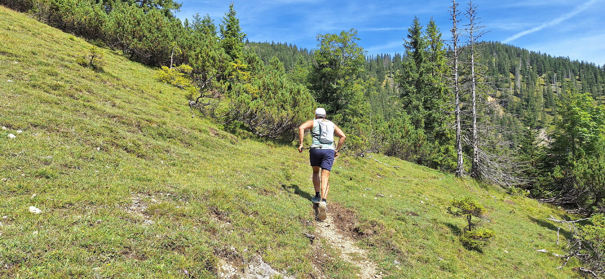 Nein, ich biege rechts ab und laufe den halben Trail rauf in Richtung „Streitberg“, laufe hoch und freue mich aufs Runterlaufen. Die Panoramen durch den hohen Sonnenstand nicht so toll wie bei „Ludwig wandert“, der mich letztes Jahr zu dieser Tour inspiriert hatte. Vorher kannte ich diese schöne Ecke in Hinterriss nicht und bin stets vorbeigefahren.