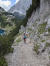 Fabian und ich blicken auf die Mondlandschaft des Brendlkars vor uns mit seinem bröseligen und schottrigen Ganghofer-Steig, der bis weit hinunter technisch schwer ist. Auf Brösel und feinem Gestein rutsche ich immer wieder nach hinten weg. Mein Mantra, nach vorne legen, Gewicht über die Füße, hilft mir wenigstens, dass ich nicht stürze.