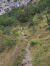 Ich laufe wieder zurück, passiere erneut vorsichtig eine ausgewaschene Stelle mit Brösel, laufe noch ein Stück hoch und gucke wieder aufs Navi. Jetzt bin ich wieder viel zu hoch. Hä! Wo ist der verdammte Abzweiger? Diesmal zurück in Zeitlupe. An der ausgewaschenen Stelle stehe ich genau am Knick. Aha, den Pfad hat es weggewaschen.